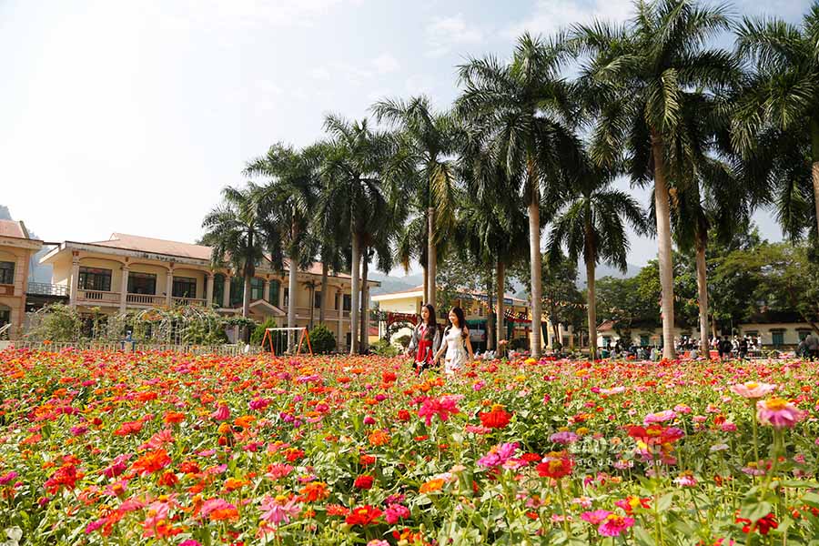 The school is covered with green trees and colorful flowers in Dien Bien