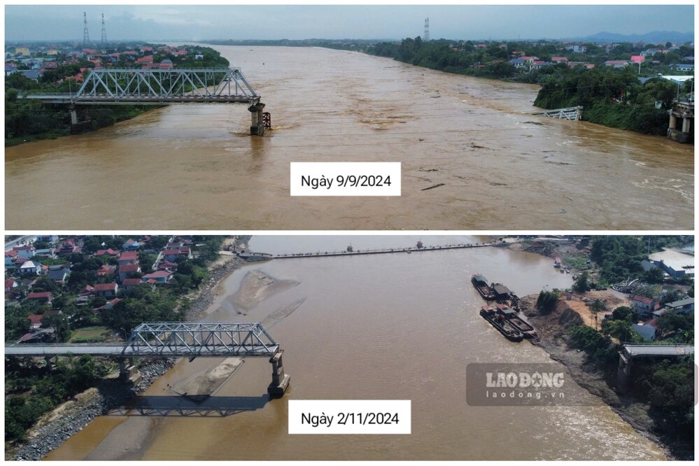Phu Tho - Compared to the time of the Phong Chau bridge collapse, the water level of the Red River in the area is decreasing, and sand dunes in the middle of the river are starting to appear.