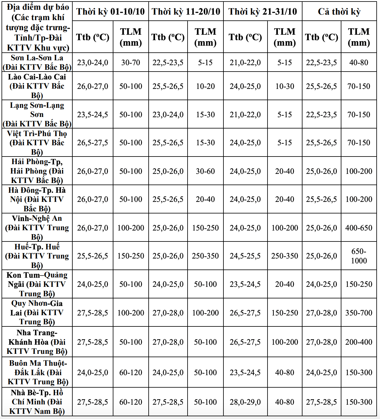 In October, there is a possibility of widespread heavy rain, concentrated in the early stages in the Northern region and Thanh Hoa. The provinces from Nghe An to northern Khanh Hoa are likely to experience some widespread heavy rains. Other areas will have many days of showers and thunderstorms; some days may have moderate to heavy rain.
