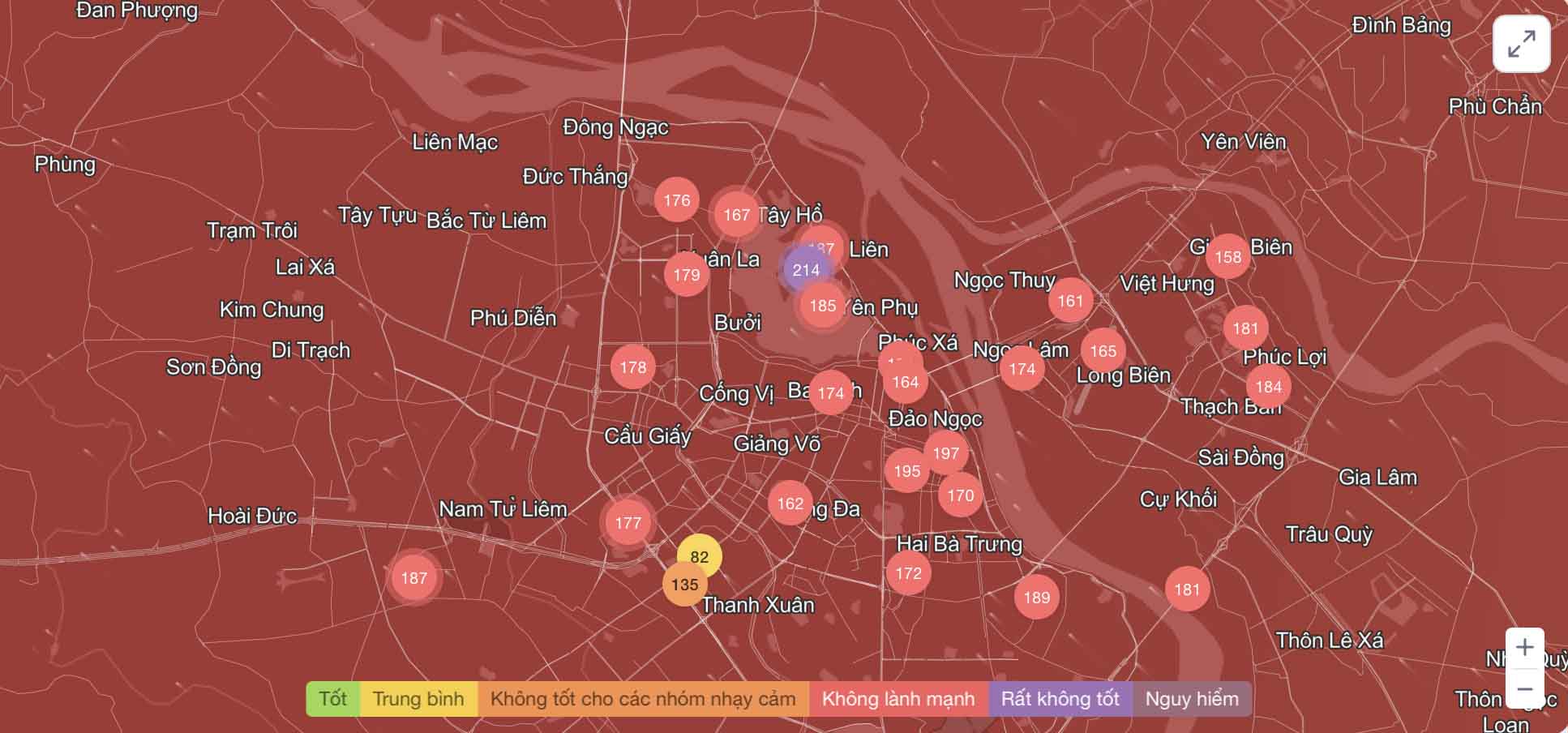 On the afternoon of January 27, the IQAir application ranked Hanoi in the group of 6/10 air-polluted cities in the world with 180 - a red threshold. With this index, sensitive people may have serious health problems and normal people may have health problems. From early morning, Hanoi's sky was covered with a dark air, this situation lasted all day, causing many people to clearly feel discomfort. At some times, some areas in Hanoi have purple air quality - a very bad level.