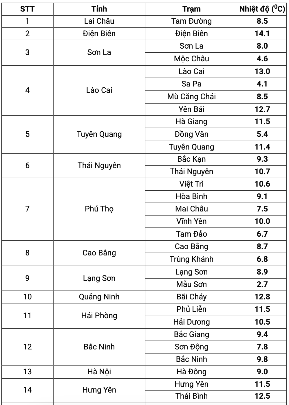 The Northern Delta region and Thanh Hoa have the lowest temperature of 8 - 11 degrees Celsius, the average temperature of 13 - 15 degrees Celsius.