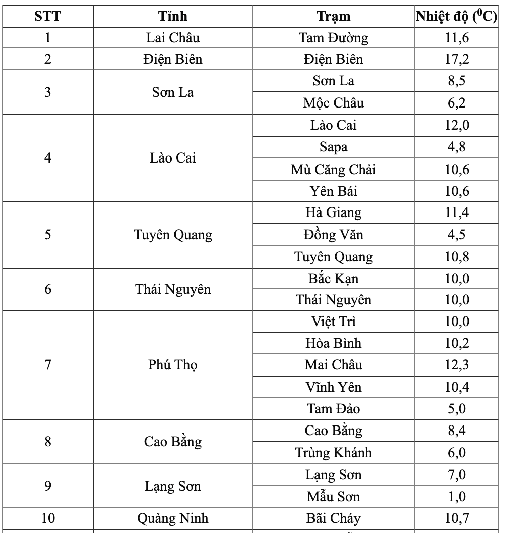 On the day and night of January 24, the Northern mountainous region has the lowest temperature of 9-12 degrees Celsius, the high mountainous region has places below 8 degrees Celsius; especially Dien Bien and Lai Chau 12-15 degrees Celsius.