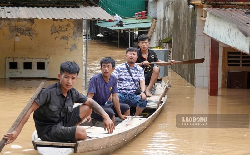 Nghe An - Heavy rain caused by the circulation of storm No. 3 caused many areas in Con Cuong commune to be deeply flooded, National Highway 7 was blocked, people had to travel by boat.