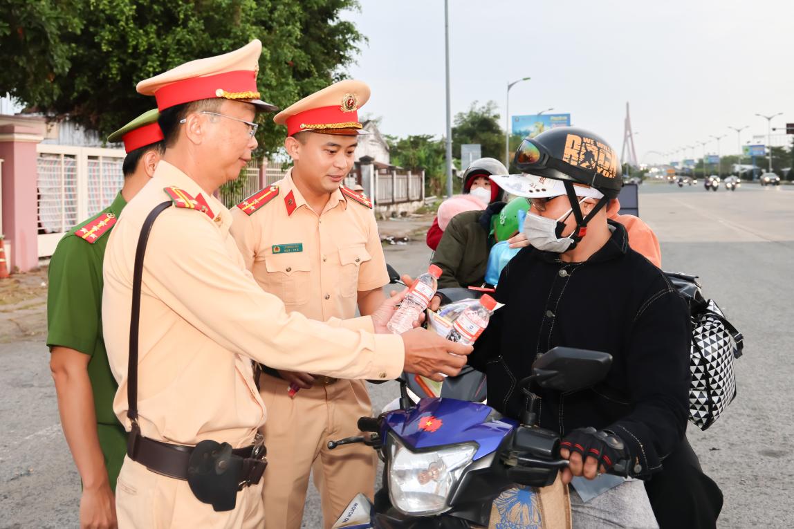 Mr. Nguyen Van N (Luong Tam commune, Can Tho city) shared: "Traveling long distances, in the sunny weather, being given drinks and free food by the police officers is very touching. Not only that, we are also reminded to drive safely, be vigilant against theft and fraud. These actions are very meaningful, helping us feel more secure and gloomy on the way home for Tet.