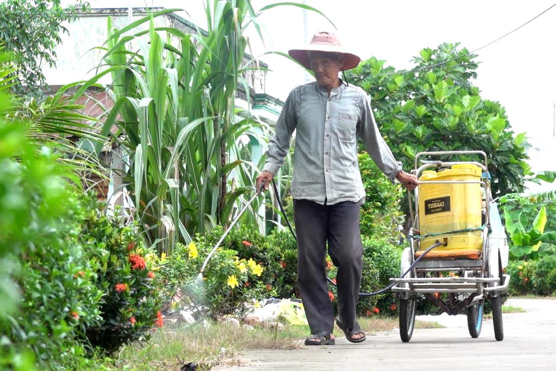 Every day, when the sky was still dark, Mr. Bay Hong began his familiar journey on the nearly 3 km long road leading through Nhon Phu hamlet. With a coconut broom, a trash can, a pruning pull and an old conical hat, he walks for exercise, sweats trash, puts grass, and pruning green trees along the road. The leaves, plastic bottles or plastic bags are all classified by hand for proper treatment.