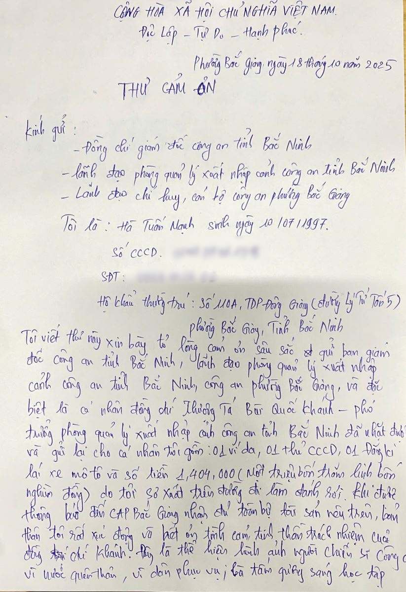 On November 2, information from Bac Ninh Provincial Police said that the unit had just received a thank you letter from citizen Ha Tuan Manh, born in 1997 in Bac Giang Ward, Bac Ninh Province, for the act of picking up lost property and returning it to the owner of Lieutenant Colonel Bui Quoc Khanh - Deputy Head of the Immigration Management Department, Bac Ninh Provincial Police.