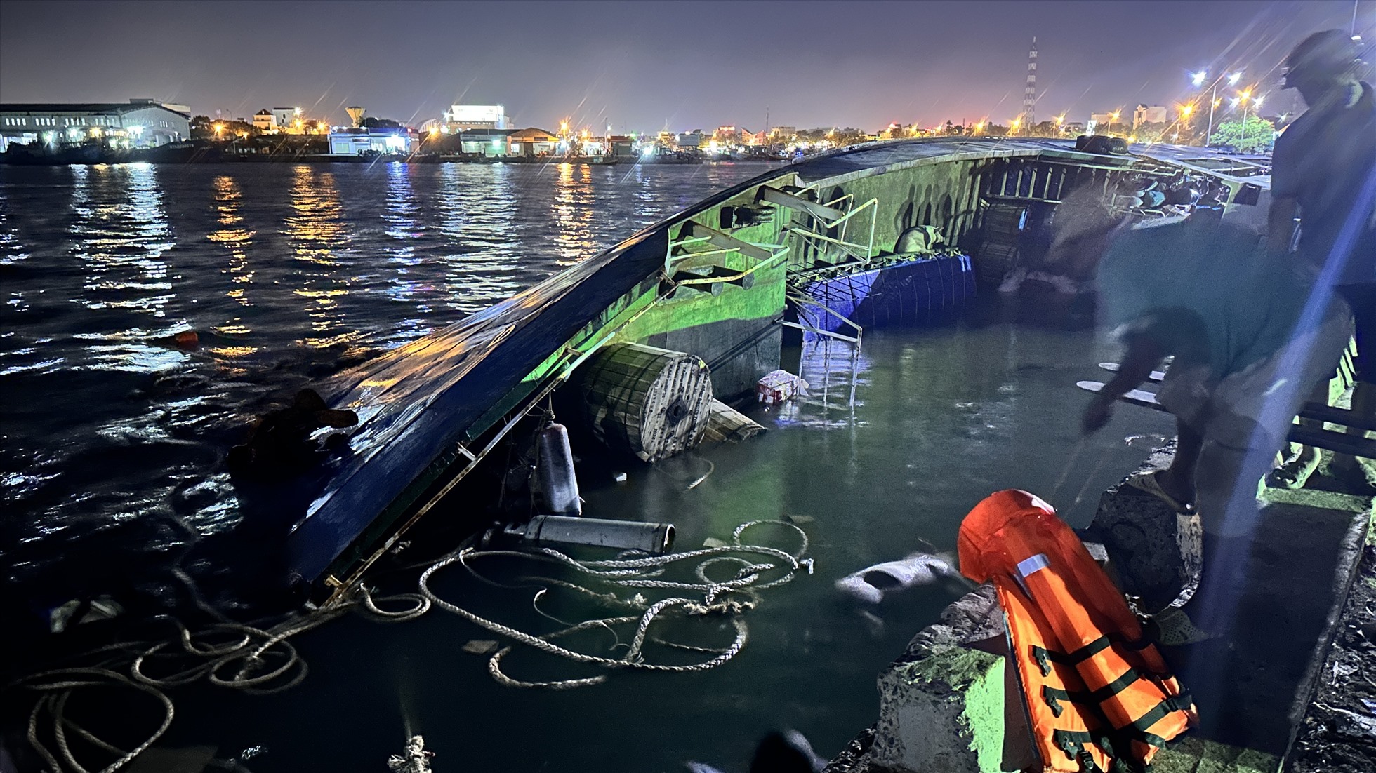 Bình Thuận - Tàu hàng trọng tải 70 tấn khi đang neo đậu và chất hàng lên tàu tại cảng vận tải Phan Thiết thì bị nghiêng, nước tràn vào khoang và chìm nửa thân. Nhiều hàng hoá trôi xuống nước, hơn 100 con heo vừa được đưa lên tàu cũng bị trôi nổi, chìm chết la liệt. Công tác cứu hộ đang được khẩn trương và ngành chức năng đang triển khai phương tiện để ứng phó, đề phòng sự cố tràn dầu.