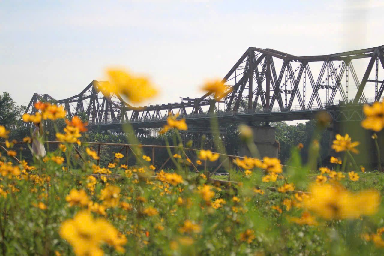 The brilliant yellow color of the daisy carpet at the foot of Long Bien Bridge (Phuc Xa Ward, Ba Dinh District) is attracting many tourists to admire and take photos.