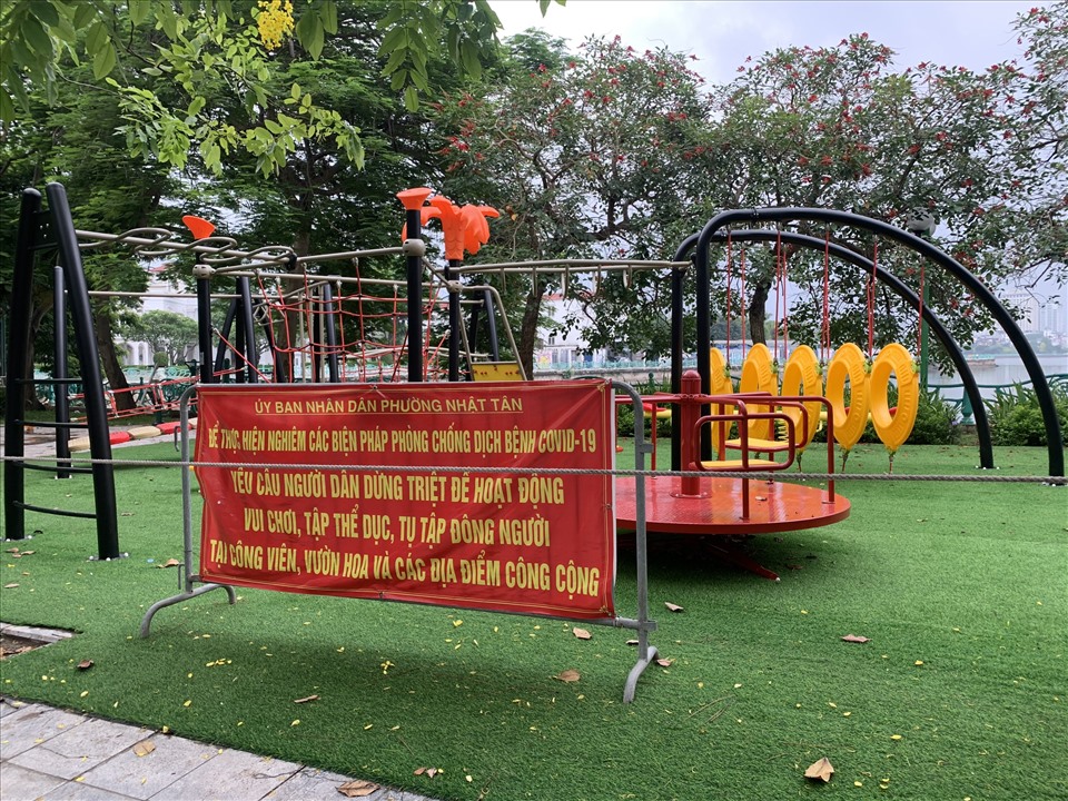 Để hạn chế người dân tụ tập tại các công viên, sân chơi trong tình hình dịch COVID-19 diễn biến phức tạp, hàng loạt máy tập thể dục ngoài trời tại Hà Nội đã được lực lượng chức năng tiến hành căng dây, phủ bạt.