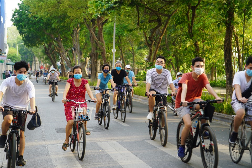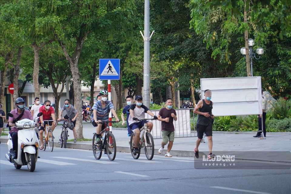 Nhiều ngày trở lại đây, từ 5-7h sáng, các tuyến phố xung quanh hồ Hoàn Kiếm (quận Hoàn Kiếm, Hà Nội) vẫn có hàng trăm người dân đi xe đạp, đi bộ tập thể dục vào sáng sớm dù dịch bệnh COVID-19 đang có nhiều diễn biến phức tạp.