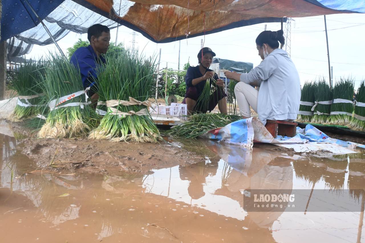 Hanoi - In the midst of the windy rain, farmers in Thuong Cat ward (Hanoi) wade through the sewers, unclog ditches, drain water to save vegetable gardens, and preserve labor.