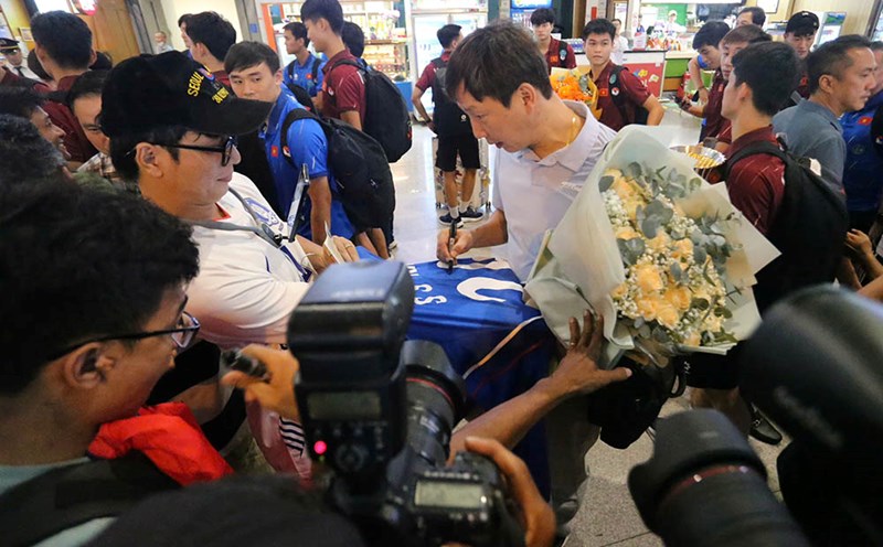 Coach Kim Sang-sik holds the championship trophy, joins U23 Vietnam to celebrate the audience's welcoming