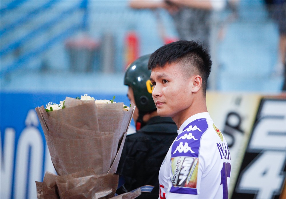 Trước trận đấu giữa Hà Nội và Thành phố Hồ Chí Minh tại vòng 7 Wake-up V.League 2019, tiền vệ Quang Hải đã được các cổ động viên tặng hoa khích lệ.