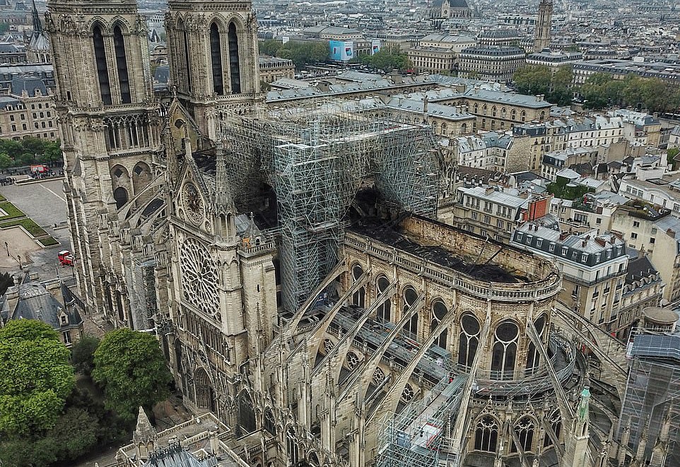 Nhà thờ Đức Bà tan hoang sau vụ cháy lịch sử nhìn từ trên cao