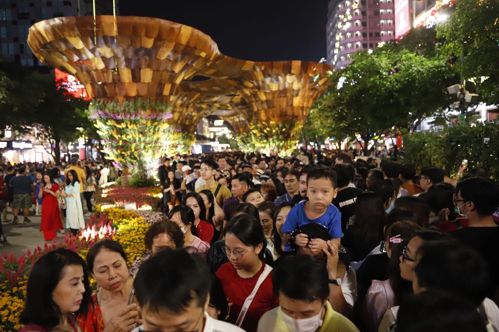 HCMC - Thousands of people flocked to Nguyen Hue Flower Street on the night of January 27 (the 28th of Tet), causing the place to be overloaded.