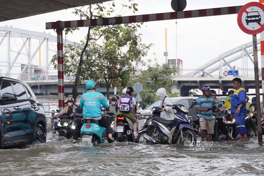 HCMC - High tide just in time caused Tran Xuan Soan Street to be deeply flooded, many vehicles stalled, and people struggled to get home on foot.