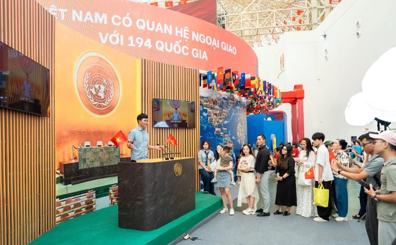 People line up to take photos simulating the session at the United Nations General Assembly when coming to the Ministry of Foreign Affairs space at the National Achievements Exhibition.