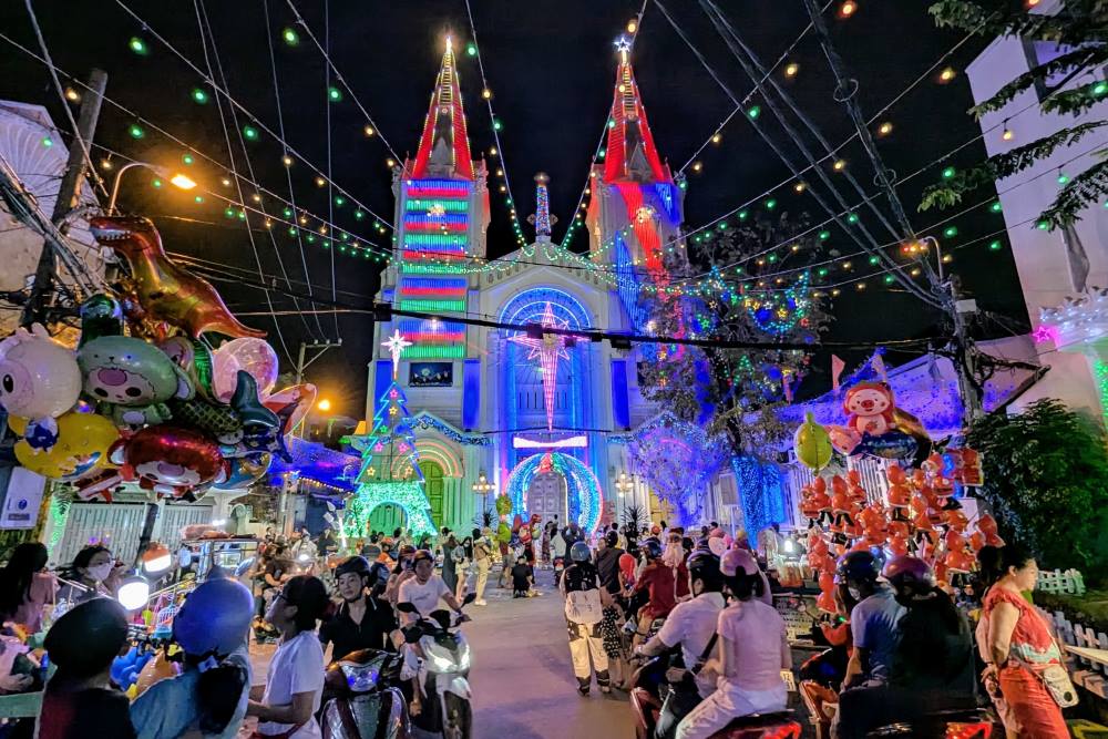 Churches in Ho Chi Minh City are brightly lit, people check in early
