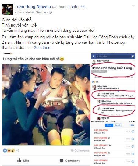 Anh cũng giải thích, tấm ảnh bị cho dùng chất kích thức là khoảnh khắc kỷ niệm của anh với sinh viên Đại học Công đoàn cách đây 2 năm. Anh cầm vở để ký tặng cho fan thì lại bị photoshop thành... cái đĩa. "Thủ đoạn khá đê tiện và dã man".
