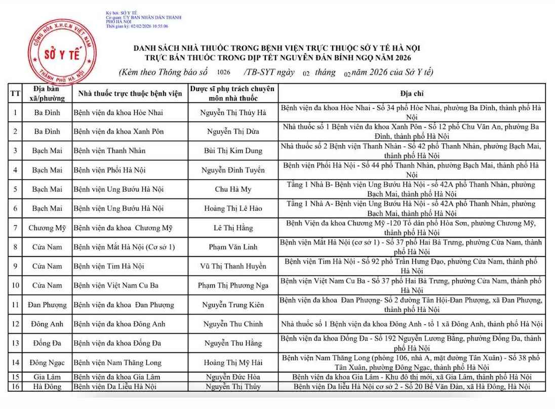 Previously, on January 15, 2026, the Hanoi Department of Health issued document No. 470/SYT-NVD on ensuring drug supply during the Binh Ngo Lunar New Year 2026. This document requires hospitals under the Department, as well as businesses with retail drug systems, to proactively develop drug reserve plans and organize drug sales on duty according to regulations.