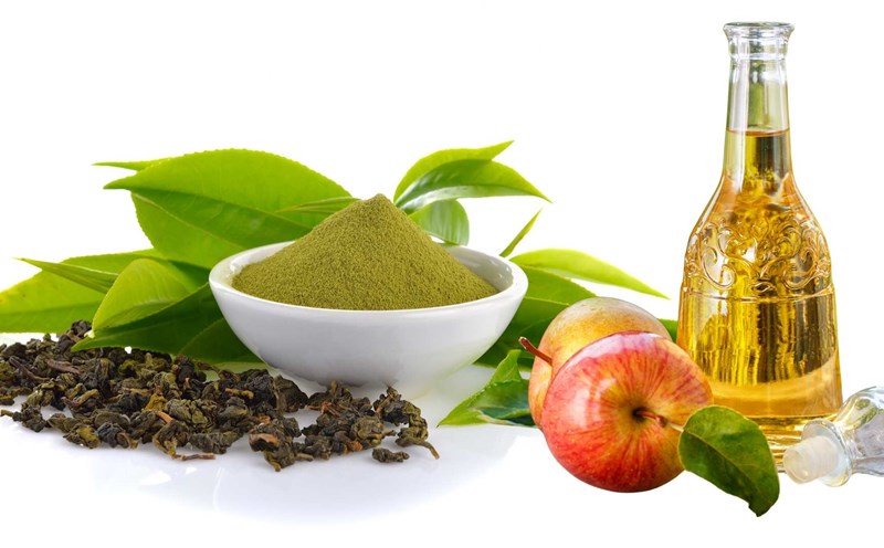 Apple cider vinegar and green tea oil helps reduce dandruff, improve dull, frizzy hair, and bring soft and shiny hair.