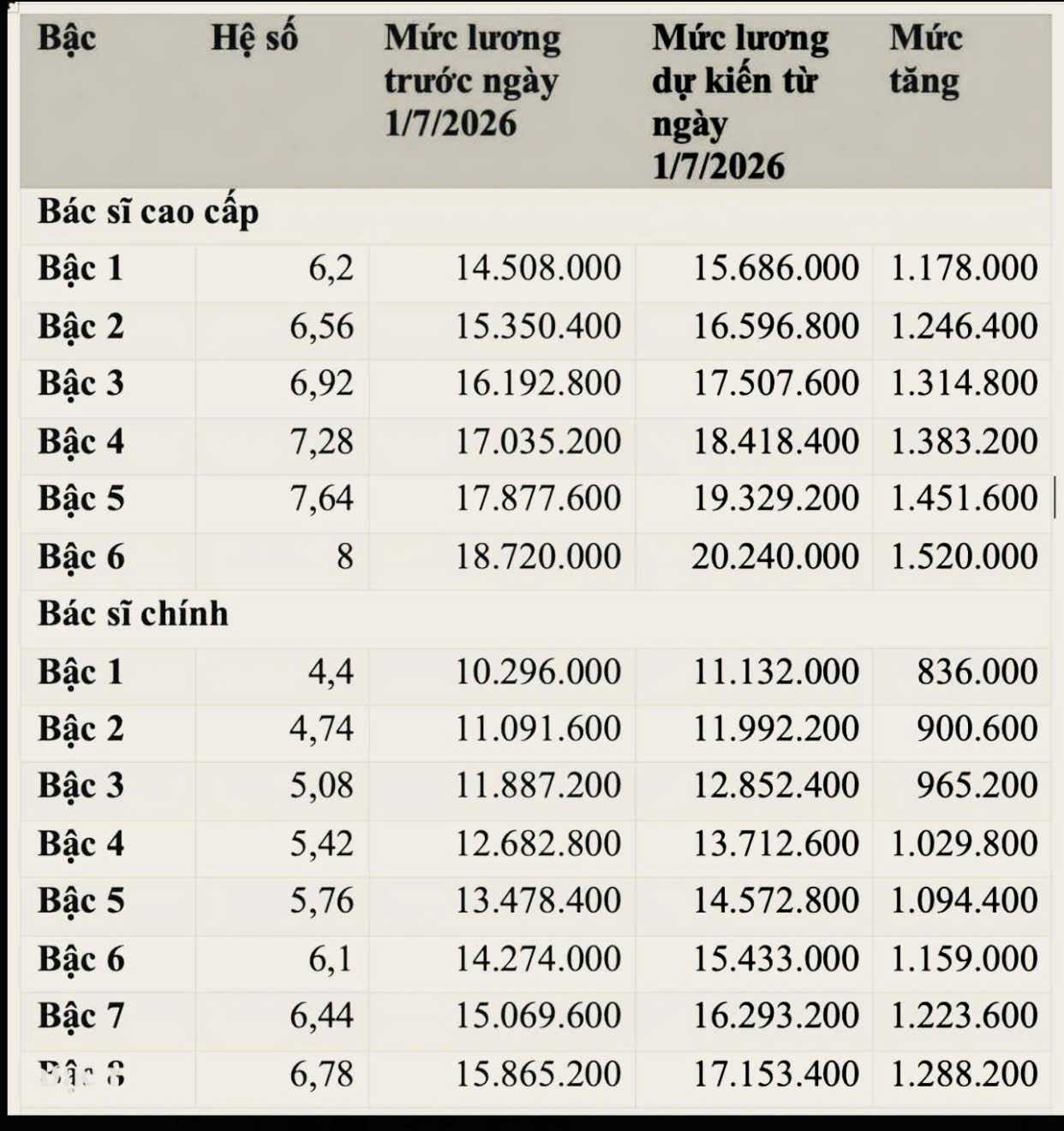 Expected doctor salary table after the proposal to increase the base salary by 8% from July 1. 2026: