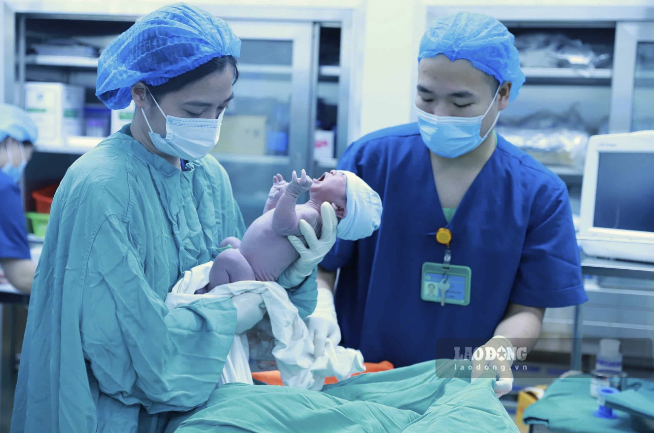 Born at 37 weeks and 2 days, the mother had a history of gestational diabetes, the baby boy was named Nguyen To Tue Minh by his parents, weighing 3.5kg, the second child of To Thi Thuy Dung, born in 1994, and Nguyen Thanh Tu, born in 1990, currently living in Dong Anh, Hanoi. Immediately after birth, the baby was placed skin-to-skin with his mother. As the first baby born at the hospital in 2025, the baby was marked and given a bracelet with the code 001.