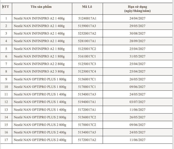 Nestle Vietnam Co., Ltd. issued a notice on voluntary and proactive recall for prevention of 17 batches of formula milk for young children of the NAN brand imported and distributed by the company in the Vietnamese market.
