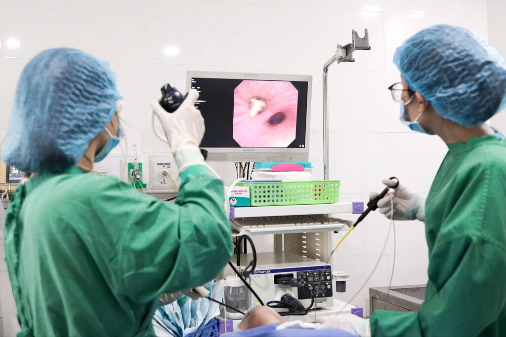 On the same morning, patient N.T.L (66 years old, residing in Quang Ninh district, Quang Binh province) was admitted to the hospital with abdominal pain and nausea. The patient informed that while taking medicine, he accidentally swallowed his dentures.
