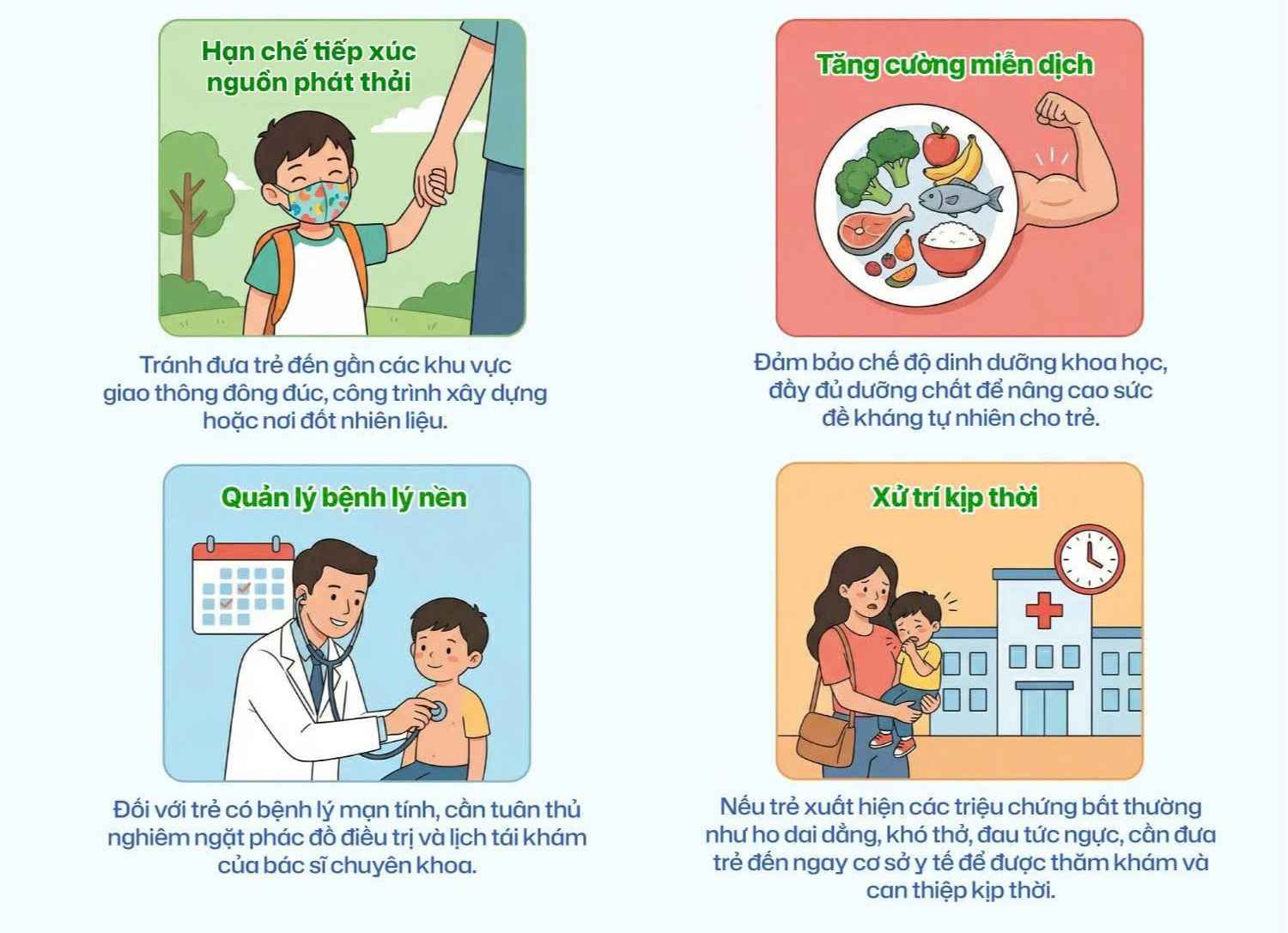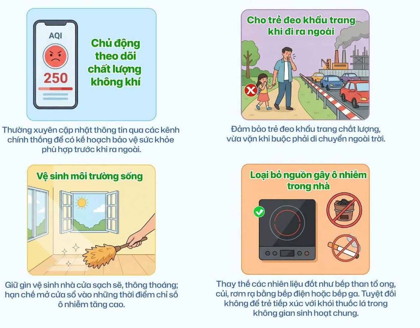 People need to wear standard masks when going out, keep their homes airy, limit smoke and dust sources in daily life, plant trees, avoid cigarette smoke and monitor their health periodically. sensitive groups such as children, the elderly, pregnant women, people with respiratory and cardiovascular diseases need to limit going out when the air is polluted, avoid areas with a lot of dust and see a doctor immediately when unusual symptoms appear.