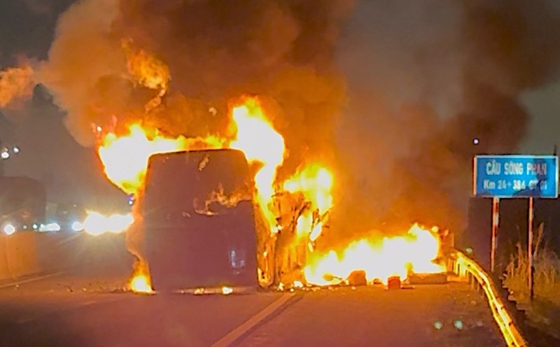 The passenger bus was traveling on the highway (through Thanh Hoa province) when it suddenly caught fire.