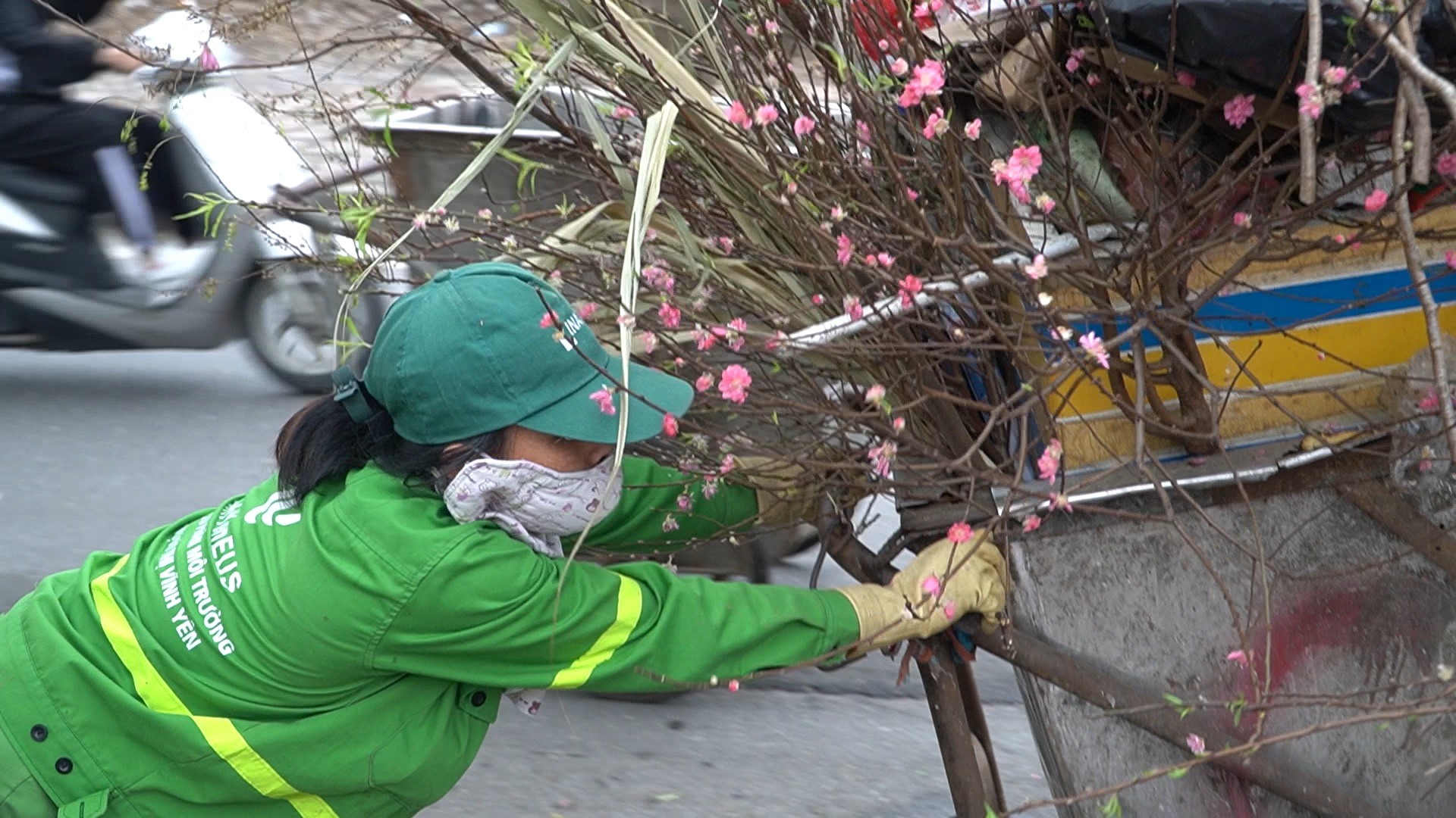 Thời điểm đào cuối vụ, các công nhân môi trường lại phải vất vả khi vừa dọn, bẻ, chặt, thậm chí là phải cưa nhỏ các cành đào để thuận tiện hơn cho việc di chuyển và cho lên xe rác.