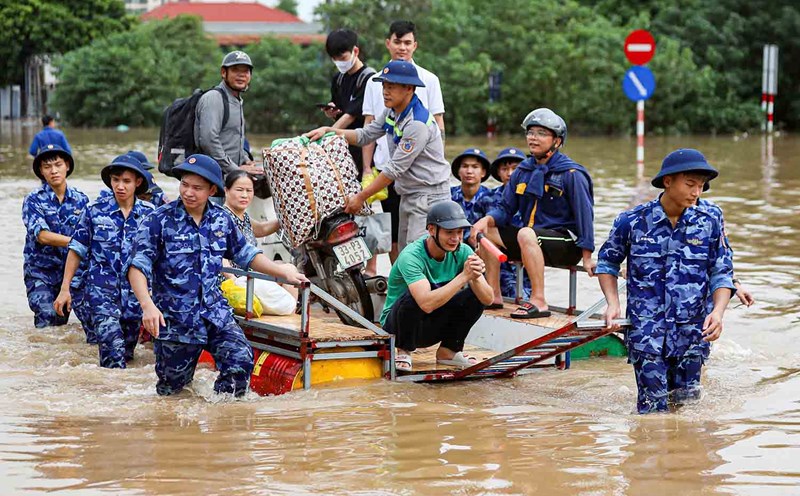 Coast Guard helps Hanoi residents get through a flooded spot nearly 1m deep