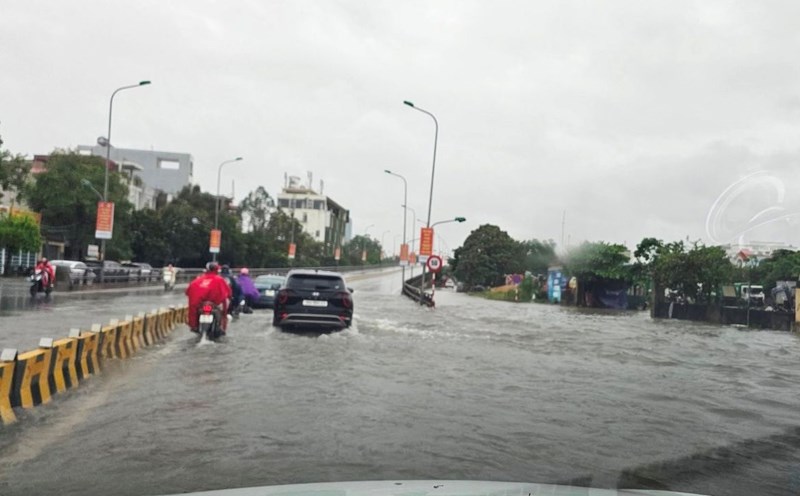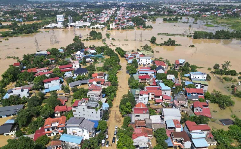 Hanoi - Due to the impact of storm No. 11, the water of the Cau River section through Trung Gia commune overflowed the dike, causing flooding in residential areas and cutting off National Highway 3.