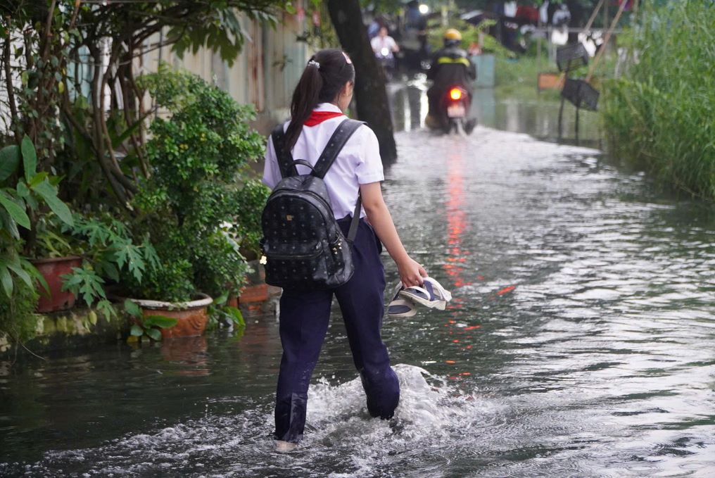 Students, Ho Chi Minh City residents remove shoes, wear pants to wade through water to get home