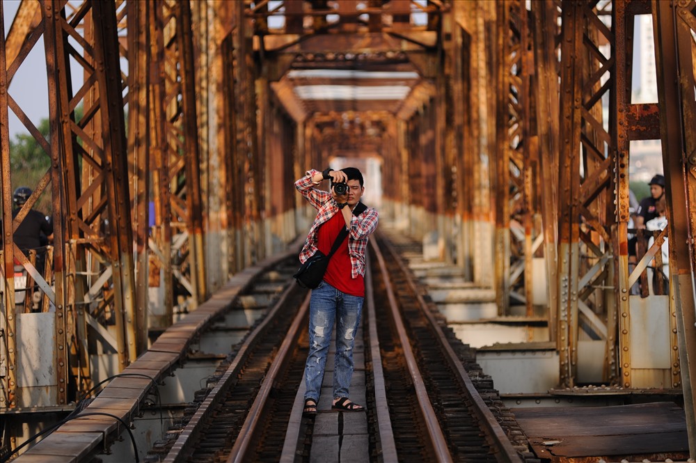 Bất chấp việc vi phạm hành lang an toàn đường sắt, nhiều bạn trẻ và khách nước ngoài vẫn vô tư chụp ảnh tạo dáng giữa đường ray tàu hỏa của cầu Long Biên chỉ vì một vài bức ảnh "độc".
