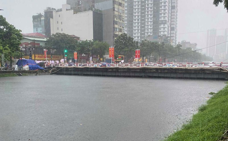 Hanoi - Heavy rain continuously fell, causing the To Lich River to rise very high. The water level of this river recorded at Hoang Quoc Viet is up to 6.11 m.