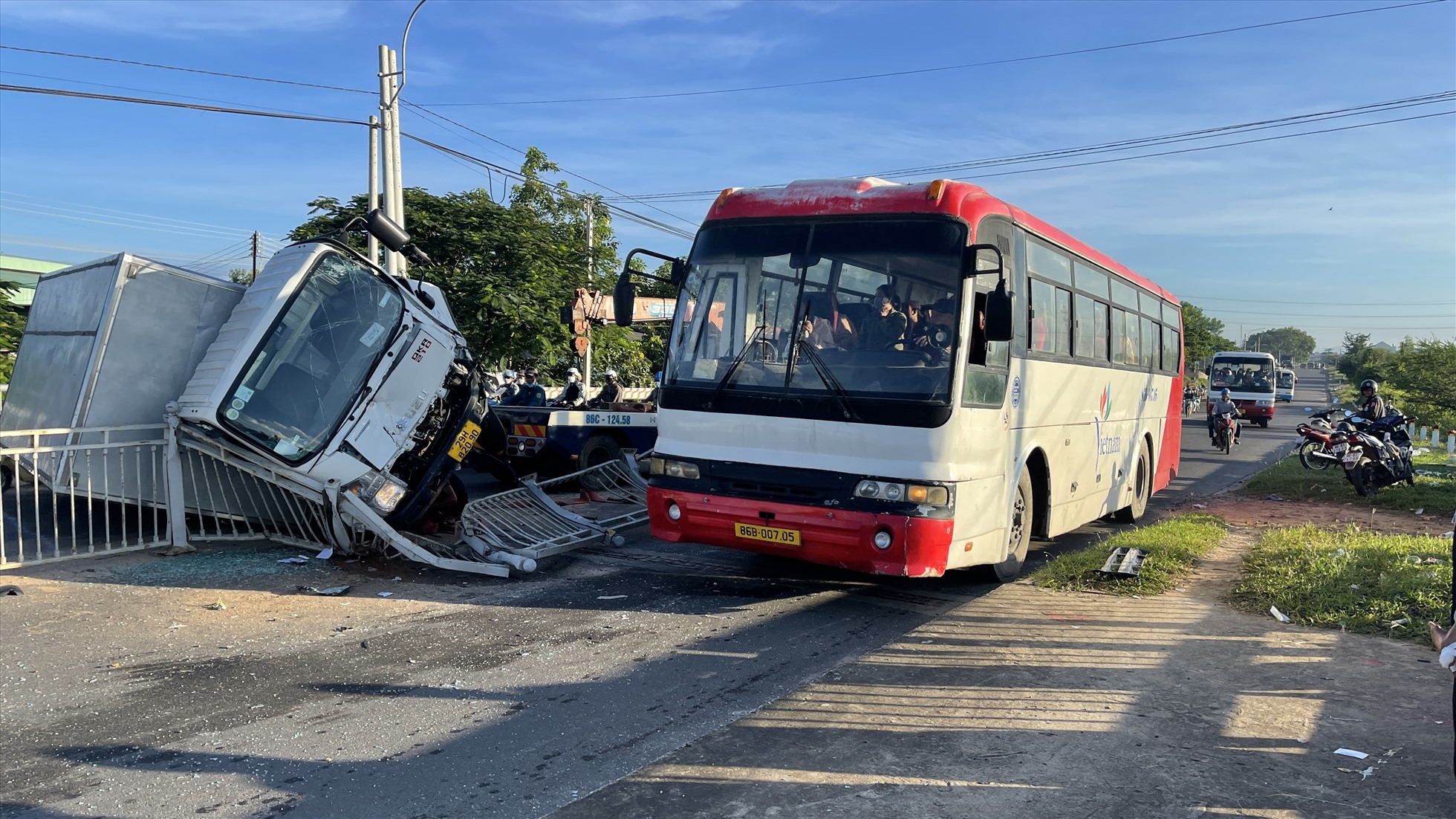 Bình Thuận – Xe tải tông vào dải phân cách bằng thép giữa cầu rồi lật nghiêng, chắn ngang 1 phần đường. Sáng sớm là cao điểm của các phương tiện lưu thông trên QL28, đặc biệt là hàng chục xe ôtô khách chở công nhân đến các khu công nghiệp làm việc lưu thông ngang nên CSGT đã phải điều tiết giao thông qua khu vực hiện trường để các xe chở công nhân, người đi làm lưu thông kịp giờ.