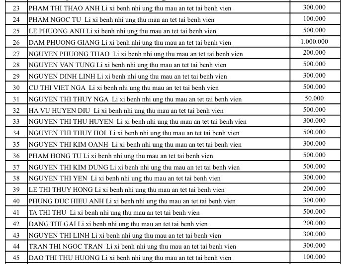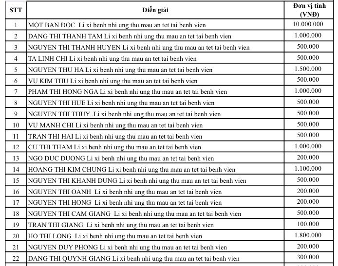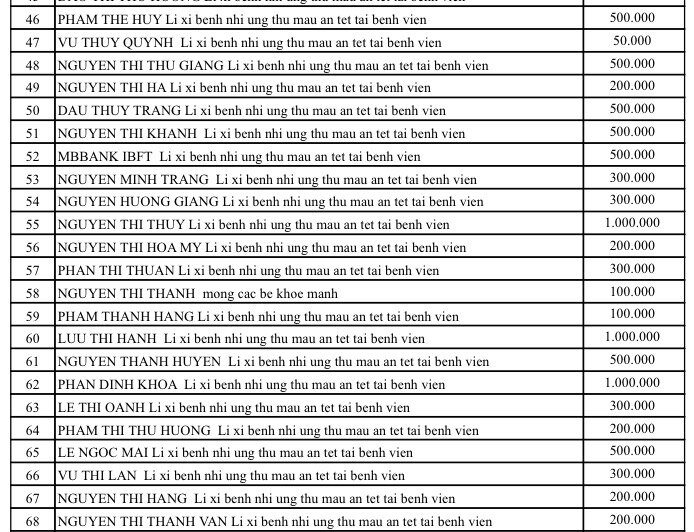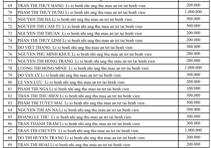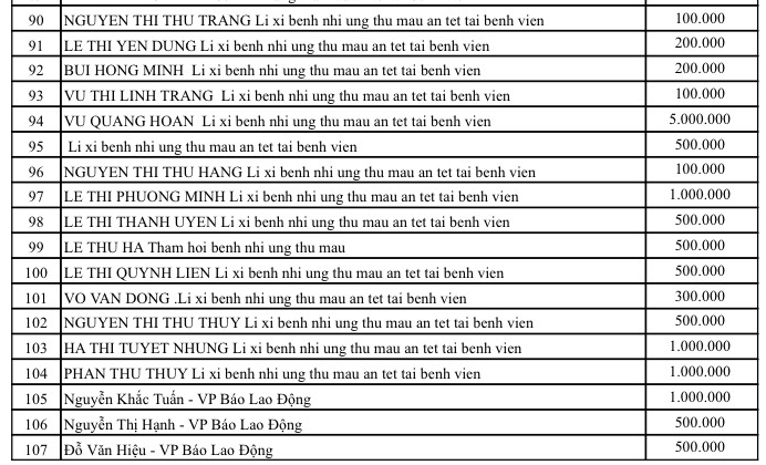 The Golden Heart Charity Social Fund sincerely thanks the brothers and sisters of Lao Dong Newspaper and readers near and far for joining hands with the Fund to share the joy with 120 sick children who will have to celebrate Tet at the bed of the National Institute of Hematology and Blood Transfusion. The amount of money you spent and I supported is just enough to divide 119 children, each child 500,000 and one child in particularly difficult circumstances is 3 million VND. Please provide information on the list of 107 readers who have supported the program: