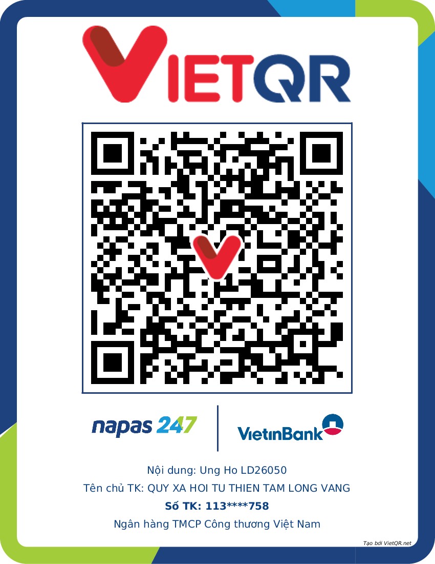 All help for life situation LD26050, Le Van Phuc, please send to Tam Long Vang Charity Social Fund - 51 Hang Bo, Hoan Kiem District, Hanoi. Account number (STK) 113000000758 at Vietinbank Hoan Kiem Branch, Hanoi; Account number: 0021000303088 - at Vietcombank Hanoi Branch; Account number: 12410001122556 - at BIDV Hoan Kiem Branch.