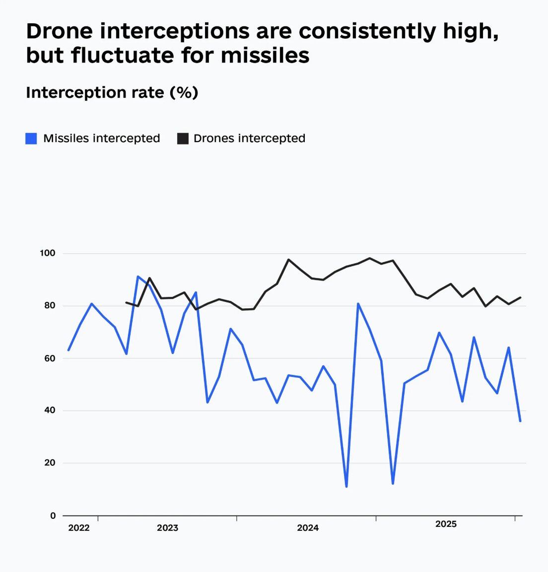 Contrary to the situation of missile response, the interception rate of unmanned aerial vehicles (UAVs) remains high.