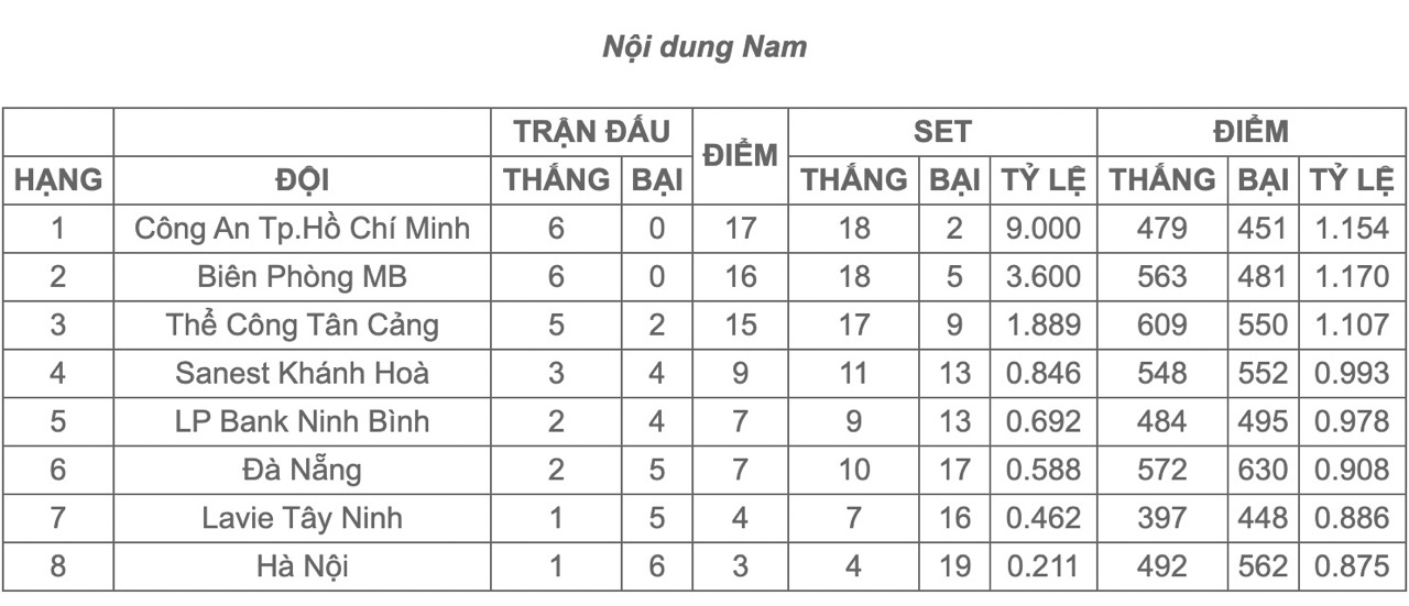 The 3 teams that have officially won tickets to the semi-finals are Ho Chi Minh City Police (17 points), Border Guard (16 points), The Cong Tan Cang (12 points). The 3 teams LPBank Ninh Binh (7 points), Da Nang (7 points), Sanest Khanh Hoa (9 points) fiercely competed for the remaining ticket.