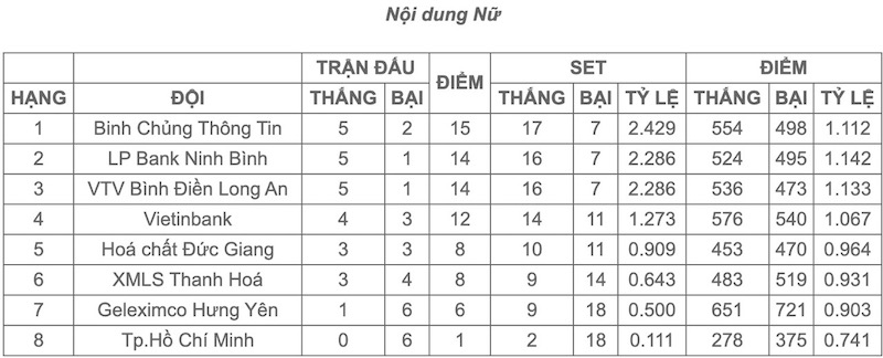 The 4 teams with tickets to the semi-finals include: Information Corps (15 points), LPBank Ninh Binh (14 points), VTV Binh Dien Long An (14 points) and Vietinbank (12 points).