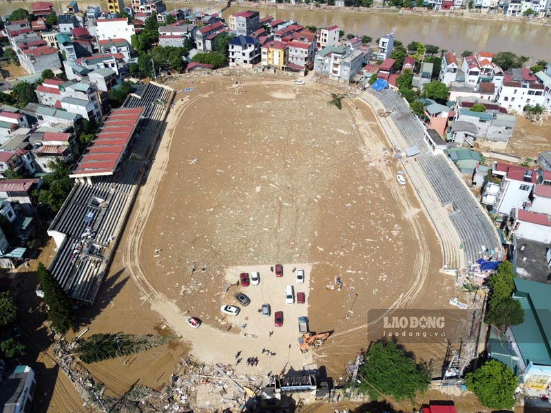 Due to the impact of storms No. 10 and No. 11, the old stadium of Cao Bang city was deeply flooded, covered with mud and garbage. The gate system and fences collapsed; stands A and B items were seriously degraded, at risk of collapsing, threatening the safety of people in the surrounding area.