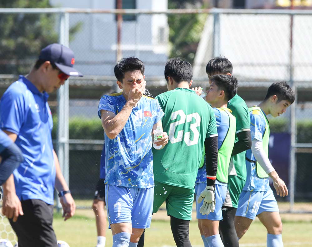 The hot weather in Bangkok caused players to have many difficulties as soon as they got out of the car, forcing many people to cover their eyes or cool down continuously to ensure concentration. However, coach Kim Sang-sik still requires maintaining high-intensity exercises, focusing on the ability to change the state and handle the ball at high speed. These are the limitations in the opening match against U22 Laos.