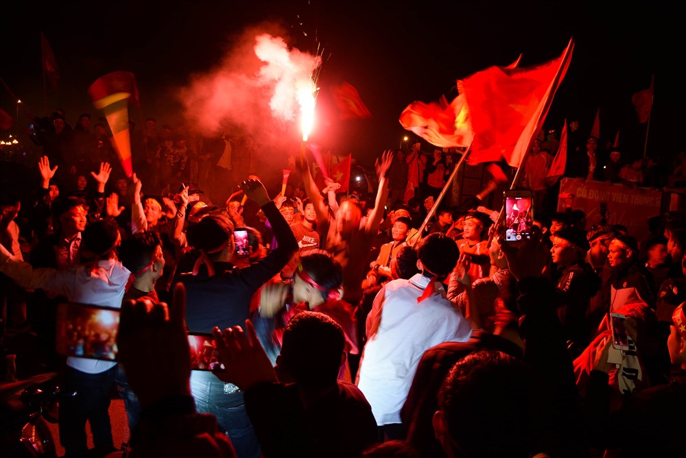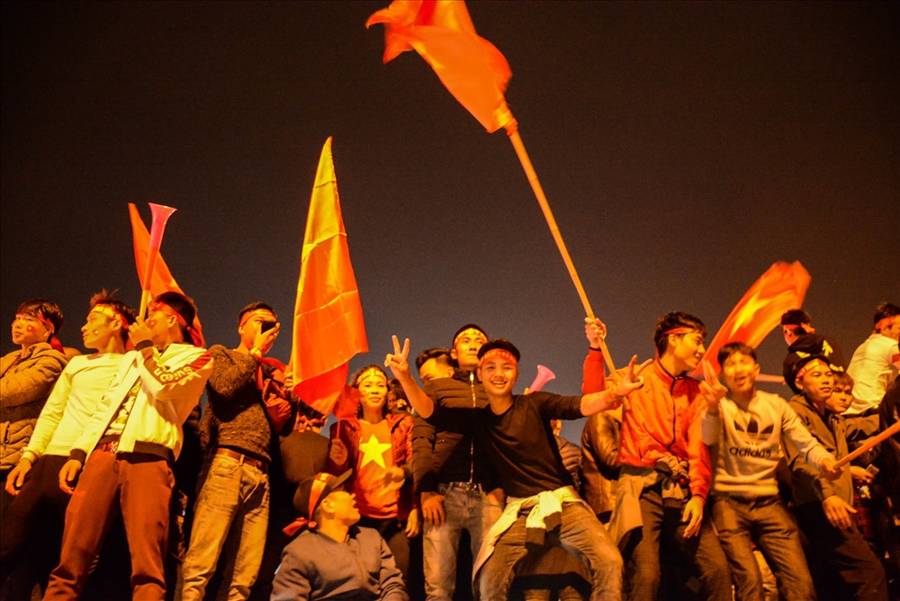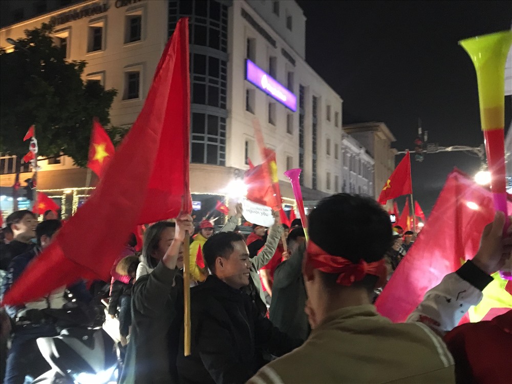 Sau 90 phút thăng hoa của tuyển Việt Nam ở trận chung kết trên sân Mỹ Đình, hàng triệu người dân Hà Nội đã đổ ra đường ăn mừng chiến tích vô địch AFF Cup 2018. Các CĐV mang theo cup, cờ, pháo sáng chạy dọc các tuyến đường trung tâm Thủ đô.