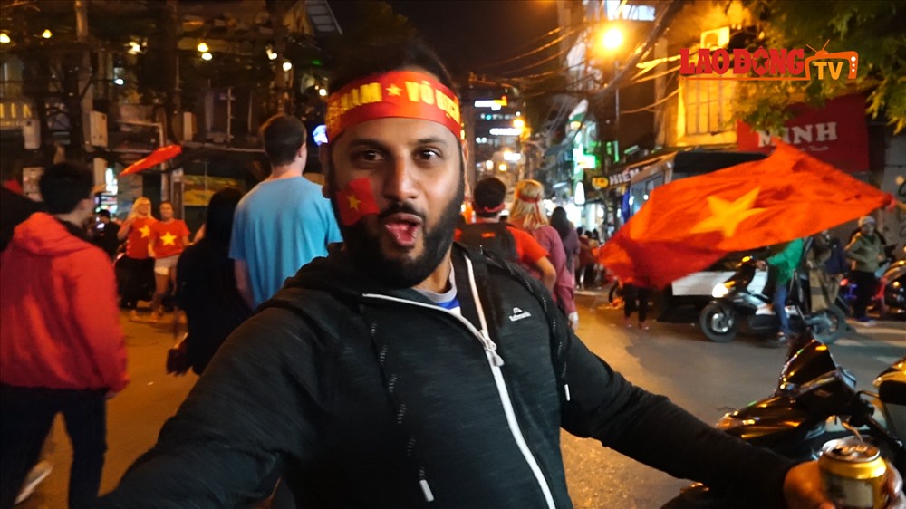 Không khí tưng bừng trên đường phố Tạ Hiện sau chiến thắng của các tuyển thủ Việt Nam tại AFF Cup đã lôi cuốn nhiều khách nước ngoài cùng tham gia.