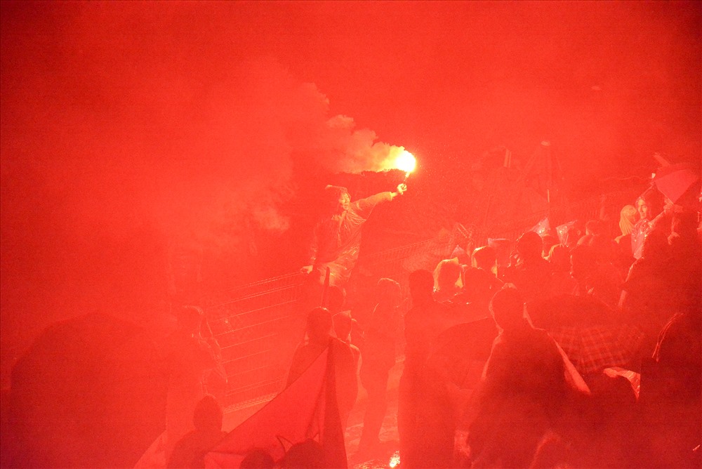 Sau 2 bàn thắng của tuyển Việt Nam vào lưới Malaysia trong trận chung kết lượt đi AFF Cup 2018, cổ động viên bất chấp trời mưa đã đốt pháo sáng ăn mừng.