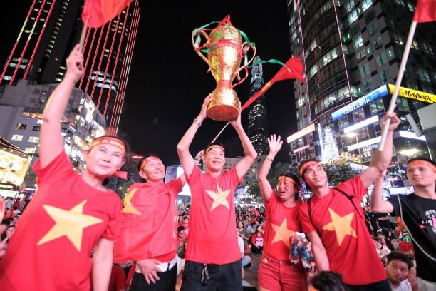 Trước khi tiếng còi khai cuộc trận chung kết lượt đi vang lên, hàng vạn cổ động viên đã tập trung về phố đi bộ Nguyễn Huệ (quận 1, TPHCM). Không khí nơi đây đang nóng dần lên với sắc đỏ và rừng cờ.