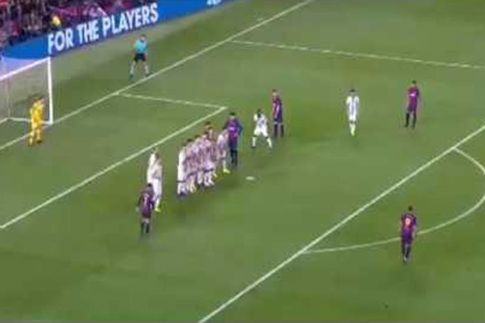 Messi há hốc mồm khi chứng kiến cú sút phạt của Suarez bị chặn theo cách khó ngờ
